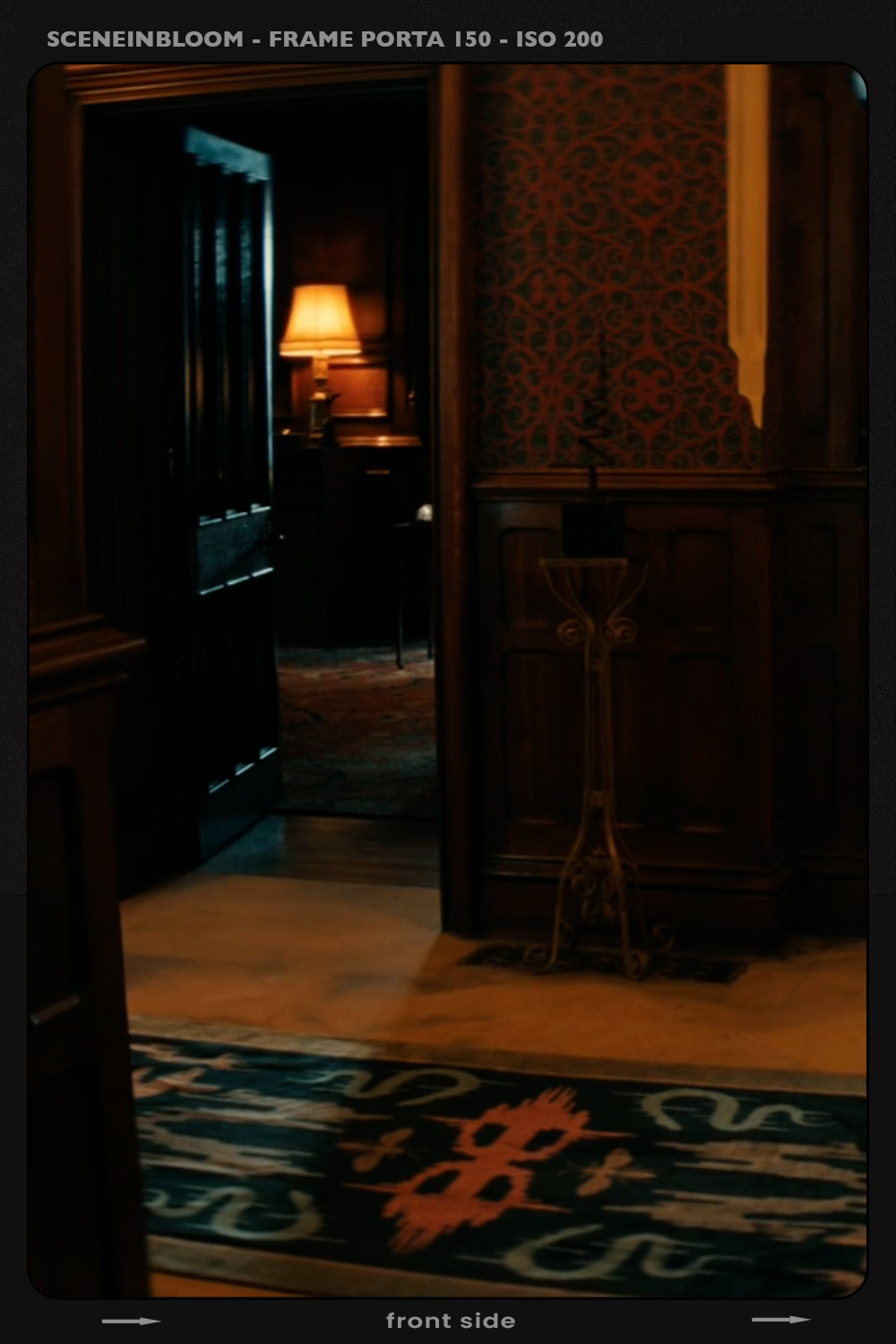 The deep reds of the ornate wallpaper and heavy wood paneling aren't just for show; they silently scream a world of opulent restraint. A distant lamp offers a deceptive warmth, its glow failing to pierce the pervasive shadows. Notice the striking, almost predatory sparkle of the patterned rug, drawing the eye deeper into the dimly lit corridor. Every meticulous arrangement of the set decoration reinforces the quiet desperation of a gilded cage. This isn't merely a set; it's a suffocating embrace