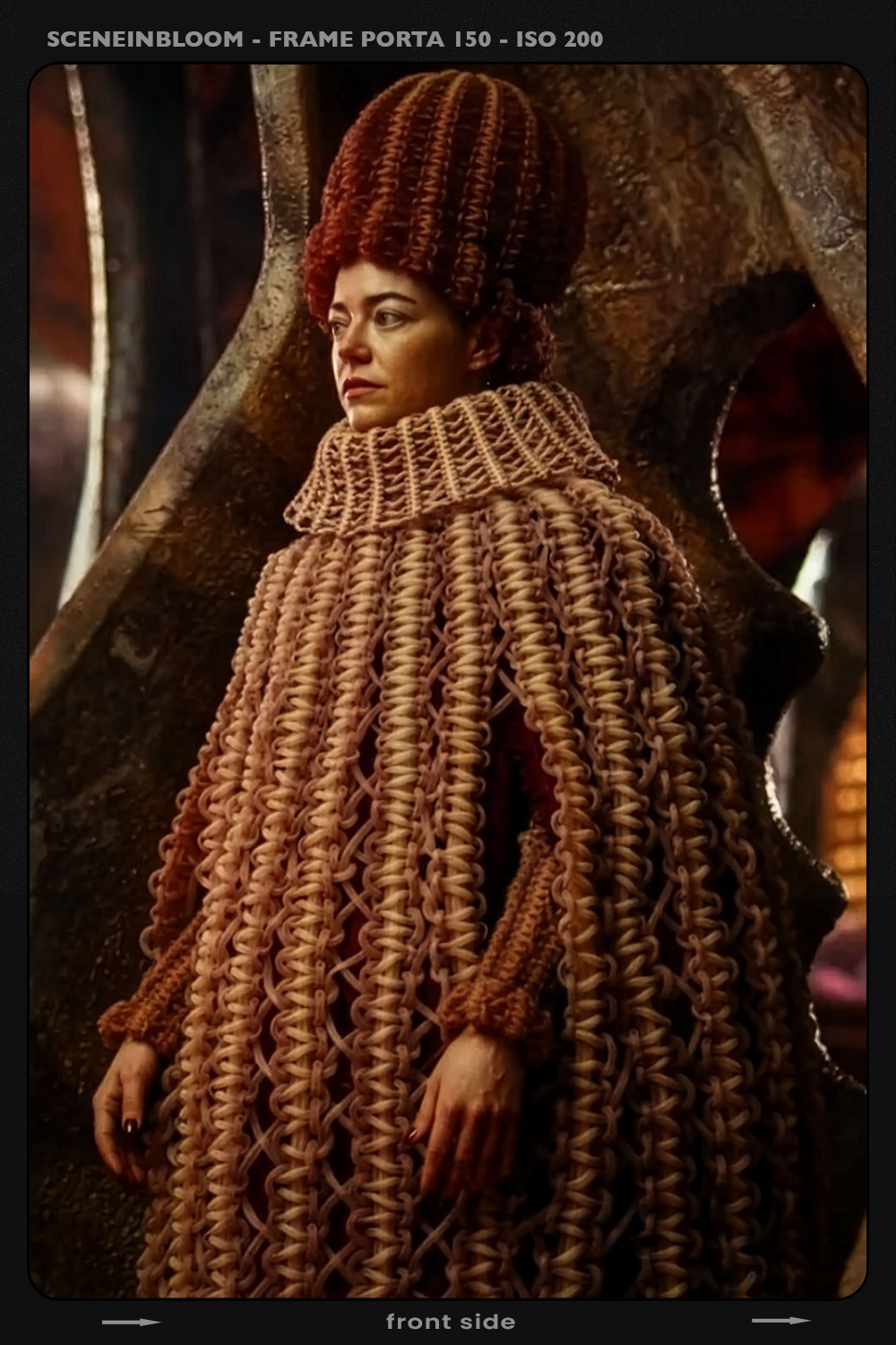 From the depths of the spacecraft, Michelle takes her place. Her elaborate cape, meticulously crafted by Jennifer Johnson from horsehair and crinoline, isn't just a garment; it is a declaration of power and communal identity. Each intricate knot and woven strand speaks to the defiant analog spirit of the Andromedans, a handcrafted armor for their Queen. The towering knitted headpiece, her crown, solidifies her regal presence.
